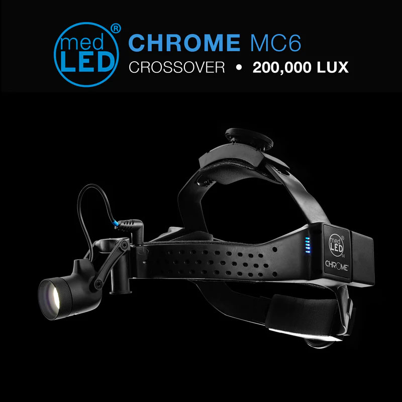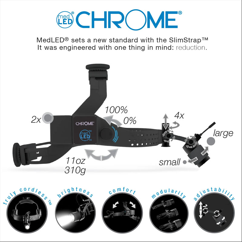 Con intensidades lumínicas de 200.000 LUX, 7 horas de batería, campo visual de 70-90mm MedLED ® Chrome fue diseñado para satisfacer todas las necesidades y tipos de cirugía.