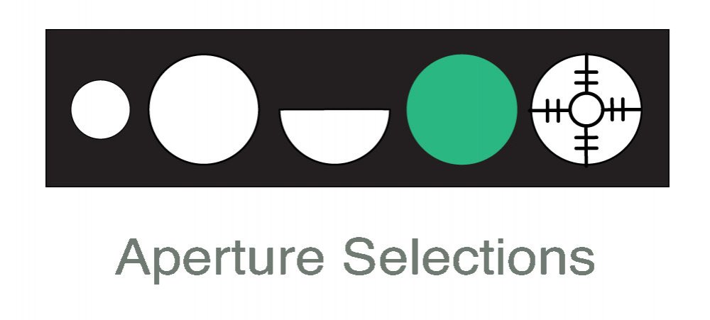 Cinco selecciones de apertura (punto pequeño, punto grande, semicírculo, fijo y filtro sin rojo)