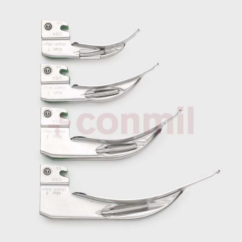 Ramas metálicas de acero inoxidable con iluminación transmitida mediante fibra óptica que permite retirar el conducto de luz para una fácil limpieza. Fabricadas en una sola pieza sin soldaduras ni uniones, con diseño mejorado para reducir la altura de la hoja en la base que ayuda a la intubación de pacientes con acceso oral limitado.